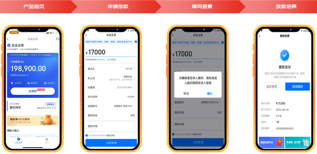 产品描述:京东企业主贷是京东科技旗下面向全国小微企业法人开放的一款纯线上信用贷款产品,也是目前为止在市场上通过率反馈得不错的发票贷,很久之前就有了,主要根据企业近一年的开票数据作为主要授信依据,通过线上模式向企业法人发放的,用于其生产经营周转的资金需求业务,产品最高授信金额100万元,企业主贷业务采用一次授信可等额本息,随借随还的用款方式,按日计息,贷款利息年化12.0%最低,使用期限长达12期,担保方式:纯信用,还款方式:支持随借随还。
