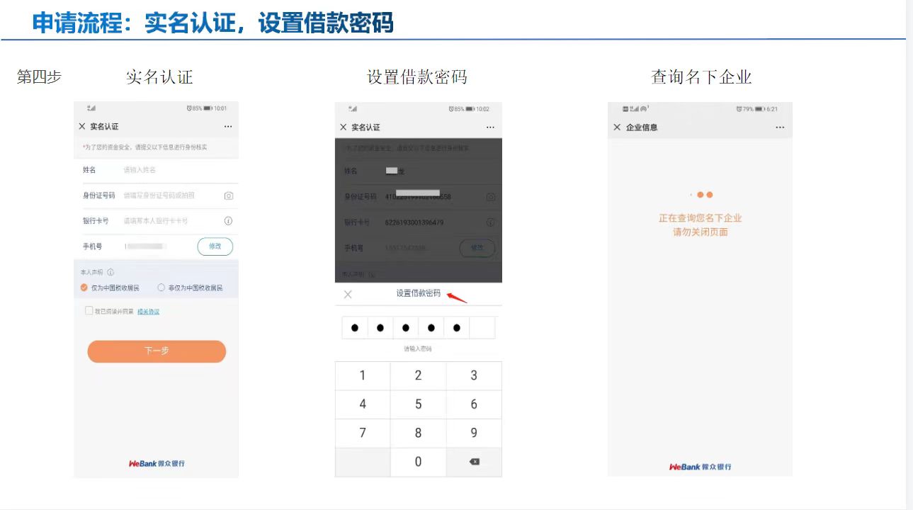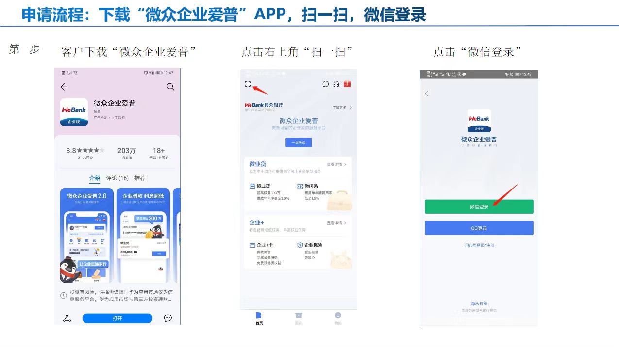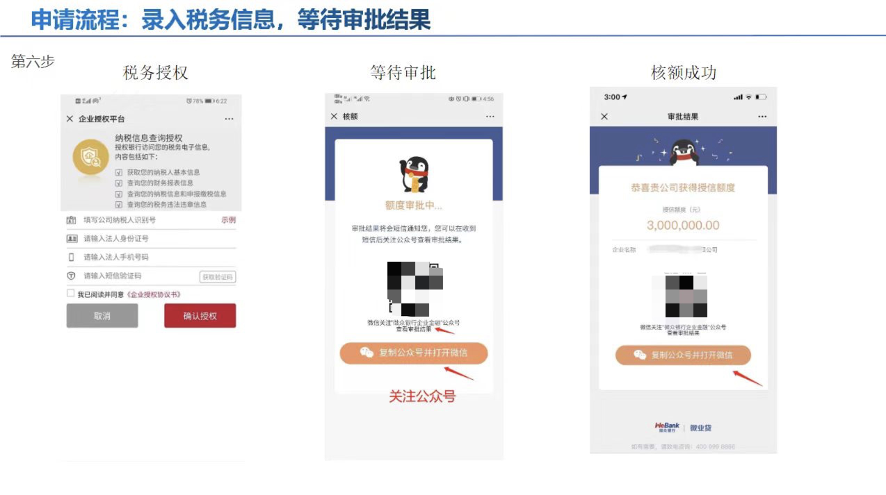 产品描述:微众银行微业贷为广大中小微企业提供线上流动资金贷款服务。企业从申请至提款全部在线完成,无需抵质押,额度立等可见,资金分钟到账,按日计息,随借随用,为中小微企业提供高效便捷的融资服务。