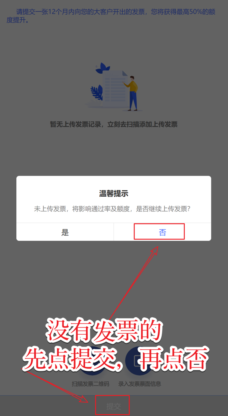 认证企业后会提示上传发票,有符合的核心发票就扫,没有就跳过发票